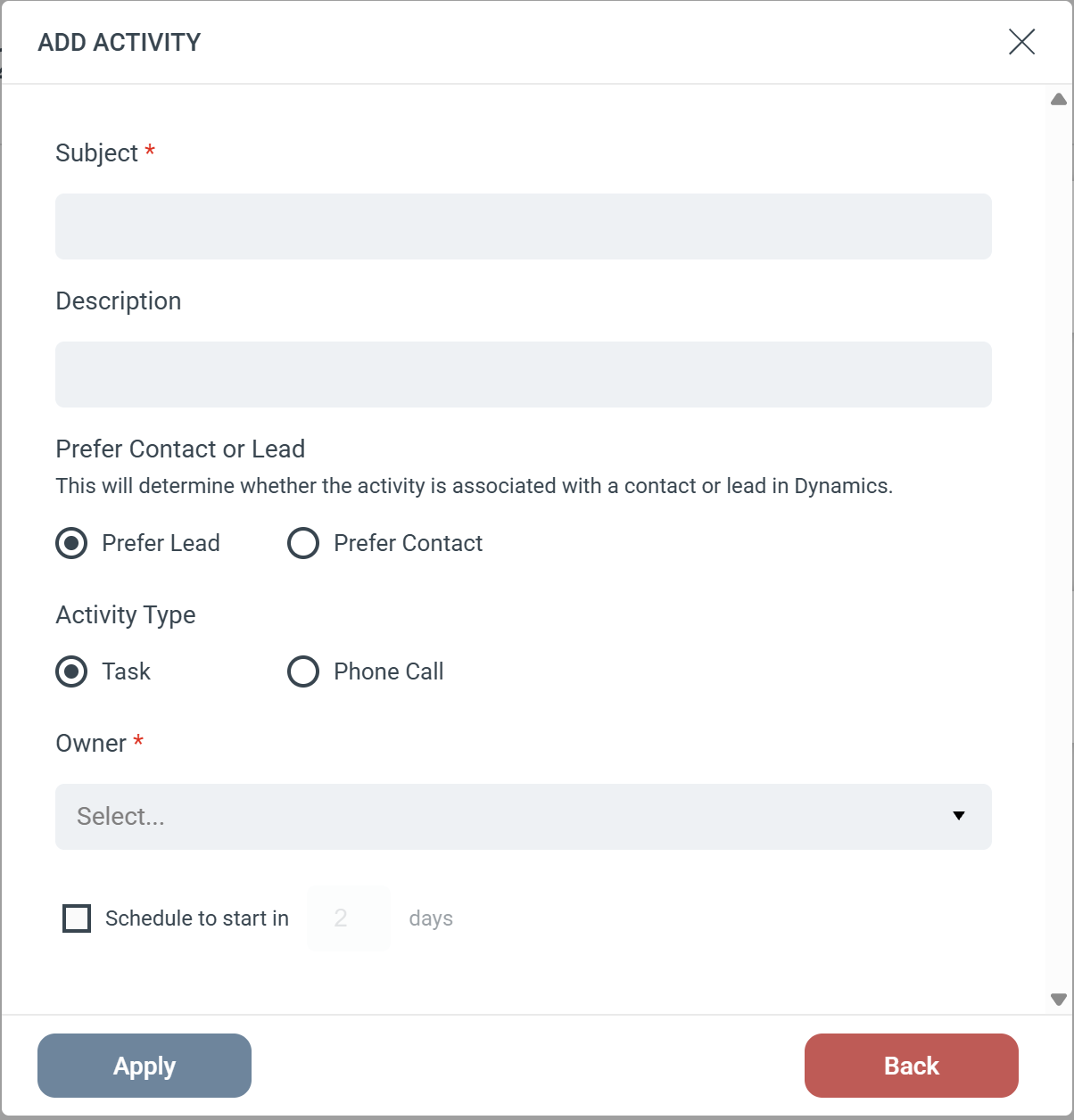 - Owner (Required): Select the Dynamics user who will be assigned the activity.