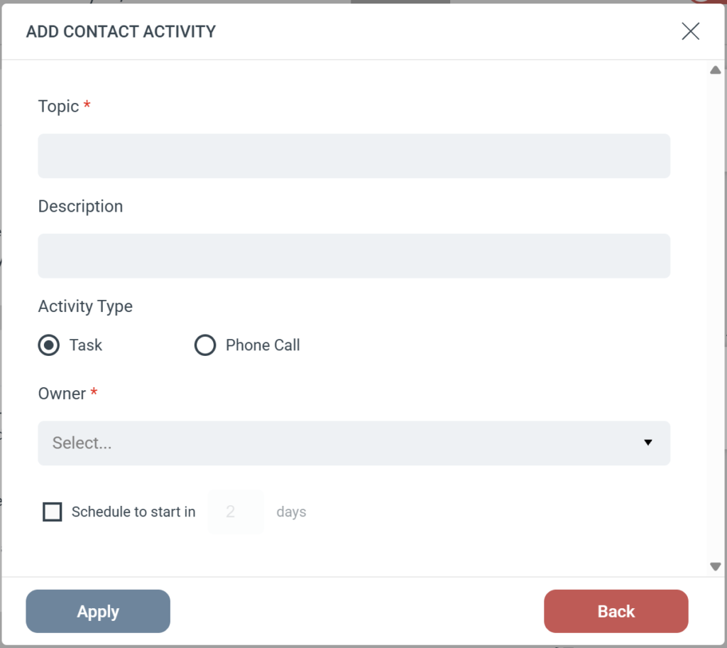 - Activity Type: Choose whether to log the activity as a Task or a Phone Call.