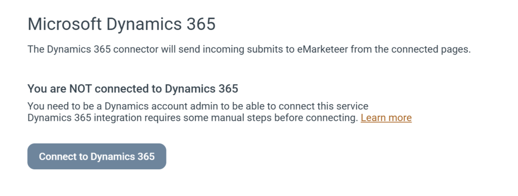 In eMarketeer, go to: Account -> Plugins & Integration -> Microsoft Dynamics 365