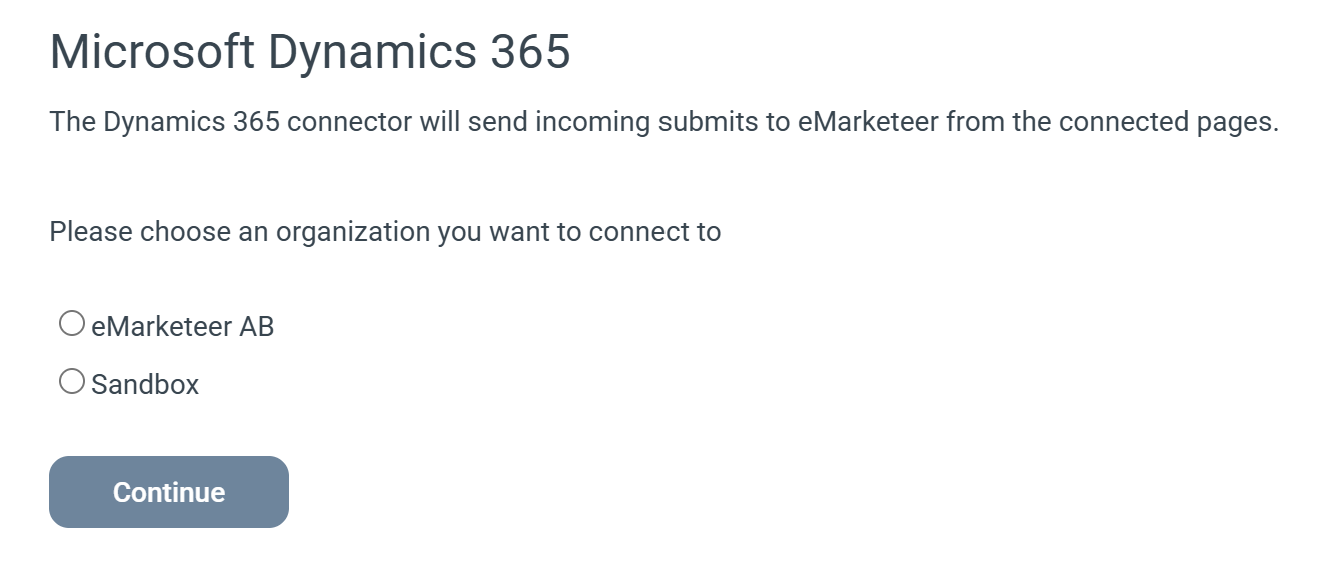 Choose the organization (environment) that you wish to integrate towards and click continue.